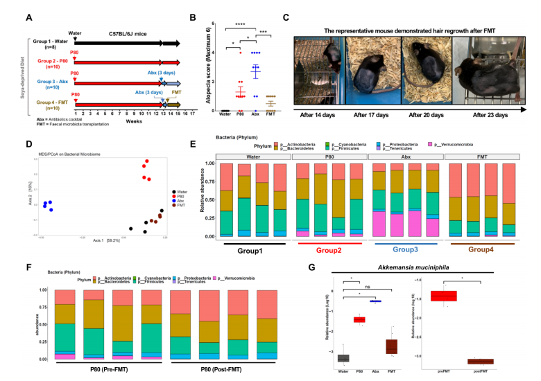 在这篇letter中,研究人员通过在无大豆饲喂的小鼠饮食中加入乳化剂聚山梨酯80(P80),成功诱导出了小鼠脱毛模型,通过对小鼠肠道菌群的检测,研究人员发现,这种脱毛小鼠肠道菌群出现失调现象,Akk菌增加、长双歧杆菌减少。为了改变肠道菌群情况,研究人员选择用抗生素/粪菌移植两种方法分别处理。结果发现,抗生素组的小鼠肠道菌群失调加重,脱发同样加剧,而抑制了健康小鼠粪便的脱毛小鼠,则出现了逆转情况,肠道菌群恢复稳态,脱毛情况也有显著改善。